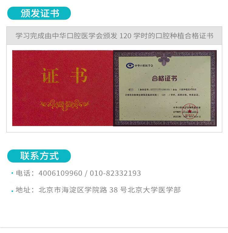 学习完成由中华口腔医学会颁发120学时的口腔种植合格证书